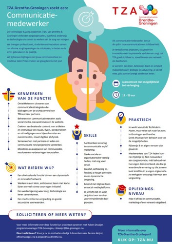TZA Drenthe-Groningen zoekt een Communicatiemedewerker. Klik op onderstaande afbeelding voor de volledige vacature.